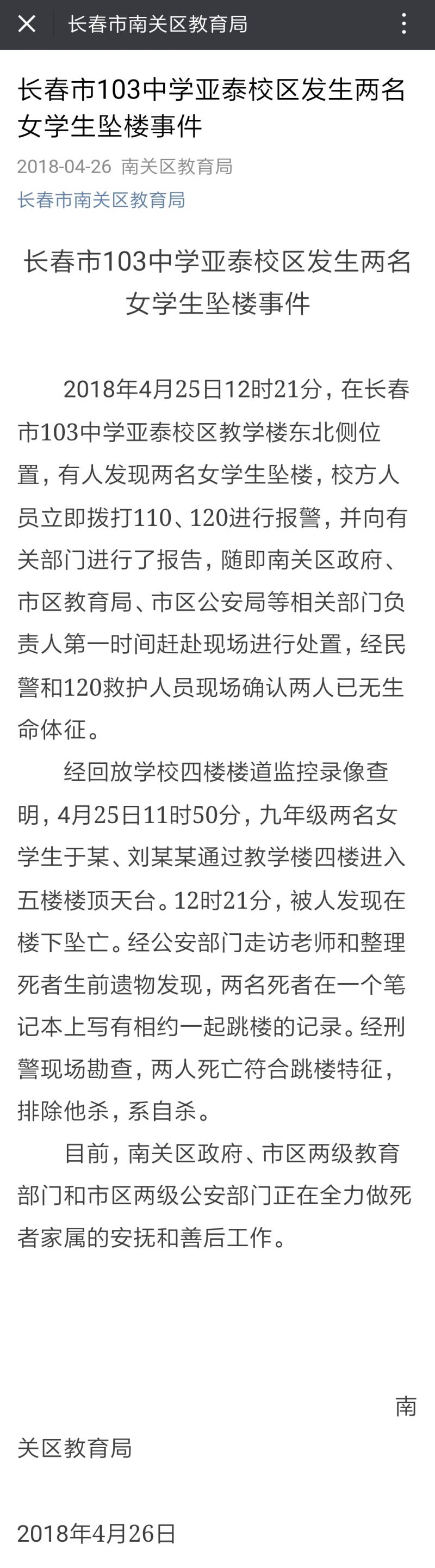 长春市南关区教育局通报:4月25日,长春市103中学亚泰校区有两名九年级女生坠楼身亡。经公安部门走访及整理遗物发现,两名死者在一个笔记本上写有相约一起跳楼的记录。经刑警现场勘查,符合跳楼特征,排除他杀,系自杀。