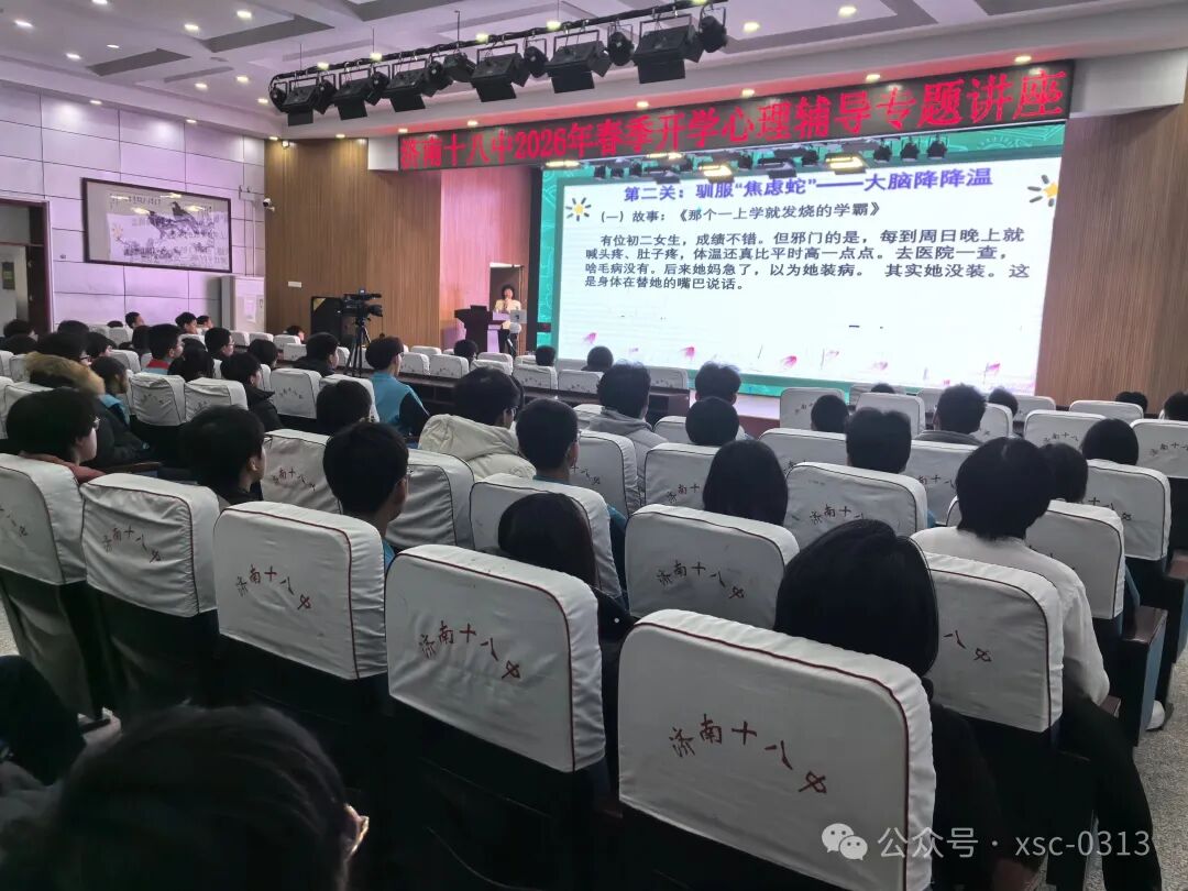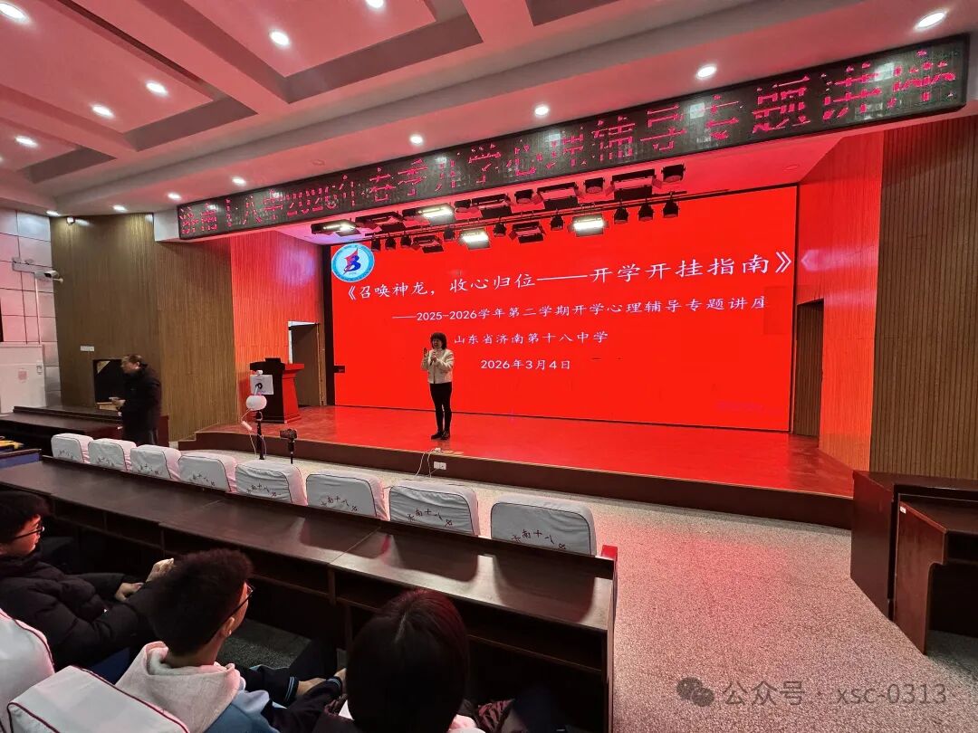2026年3月4日,济南心理健康教育研究会会长、山东省新时代青少年心理学研究院院长、实战派心理专家张馨应邀到济南第十八中学,以“召唤神龙,收心归位——开学开挂指南”为主题,为学生春季“开学第一课”开讲。